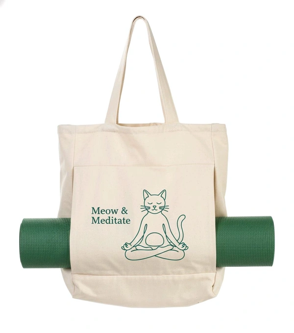 The Meow & Meditate Canvas Tote Bag blends mindfulness with playful charm. Crafted from durable natural canvas, this tote features a minimalist meditating cat illustration and a soothing green print. Designed with a dedicated outer strap to hold your yoga mat, it’s perfect for studio sessions, weekend errands, or mindful everyday carry.